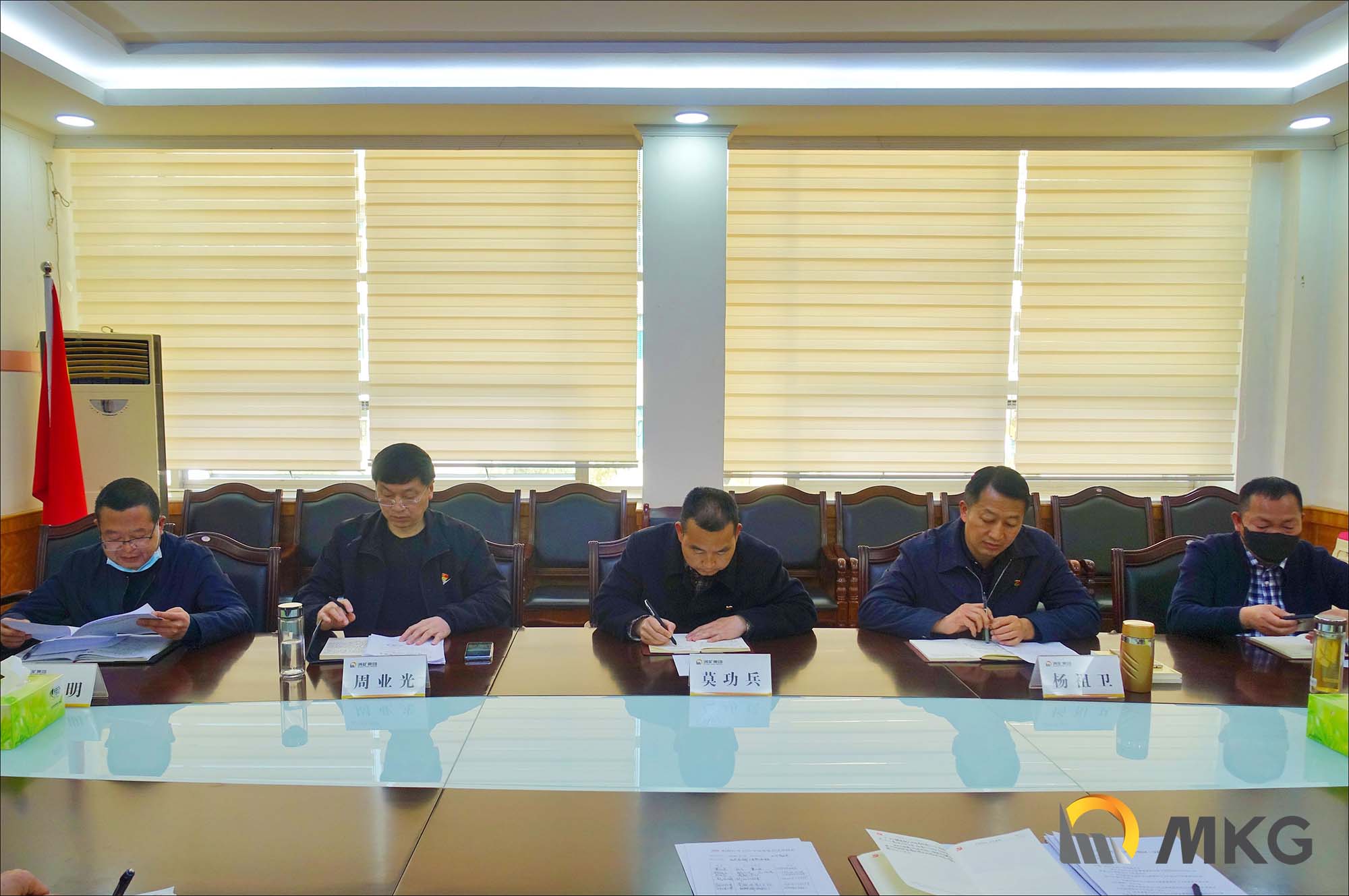 图为集团公司党委书记、董事长莫功兵(中),集团公司党委副书记、总经理杨祖卫(右二),集团公司党委副书记周业光(左二),集团公司副总经理周宗祥(右一)、工会主席王大明(左一)参加集中学习讨论会。